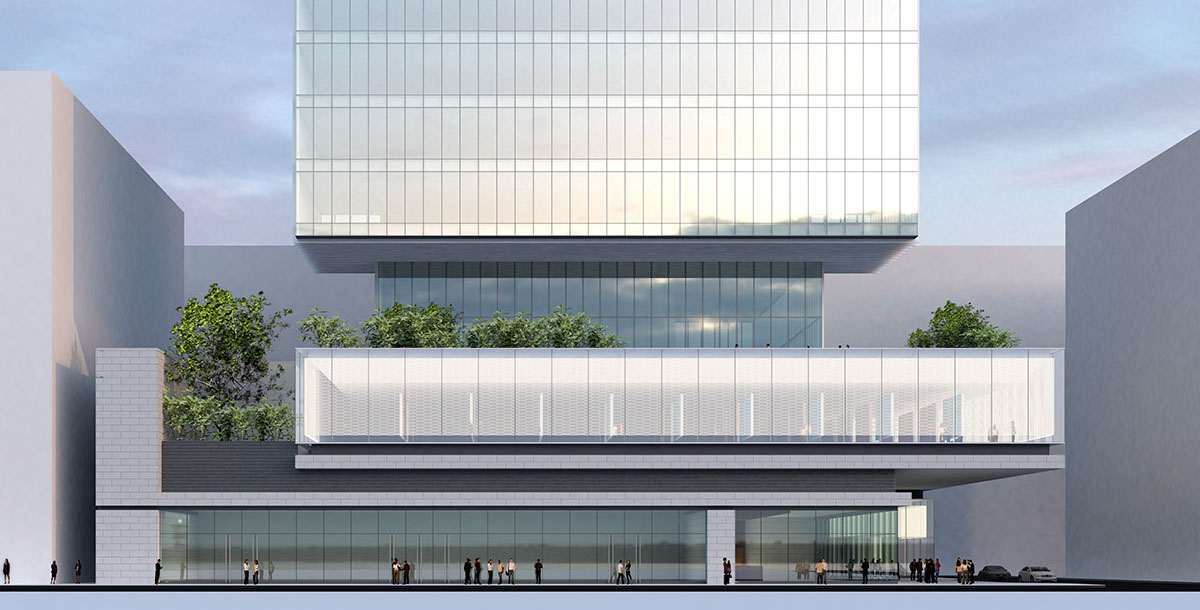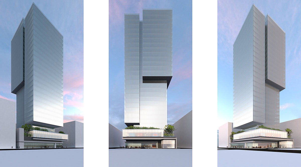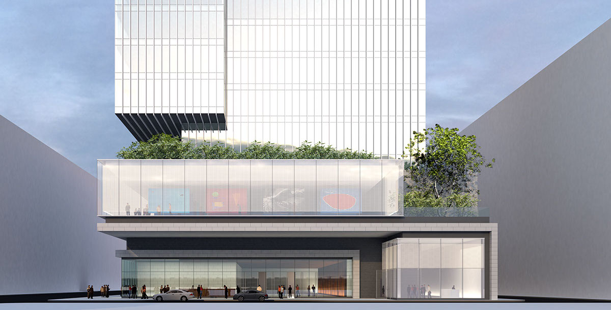The architectural language of the tower is one of simplicity and a minimal expression. Analysis of the sun path and environmental concerns inform the design, a fin system has been implemented on both the East and West façades to provide shading and prevent glare. At street level, the massing has been broken into volumes which are informed by the usage of the spaces. The key architectural component is a 'floating' exhibition space which fills the full footprint of the site at the first floor level. This area requires a dynamic architectural element that addresses both the interaction with the street and the design in its entirety. The gallery has a museum like quality and can be read as a floating light-box. The Gallery entrance is located on the West Facade and articulates a vertical link to both the podium and the tower above.