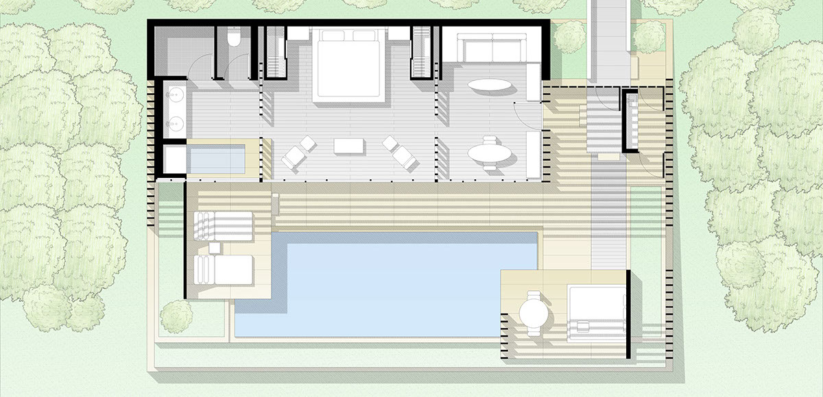 The Shen Xian Wang Resort is set in a beautiful mountainous surrounding. The minimalistic design of the Resort has been inspired by the natural elements of the place: wood, stone and water. Each Villa is organized around a private pool that spatially connects all the different parts of the program: Living room, bedroom, hot-spring bathtub, sun deck and outside living room.