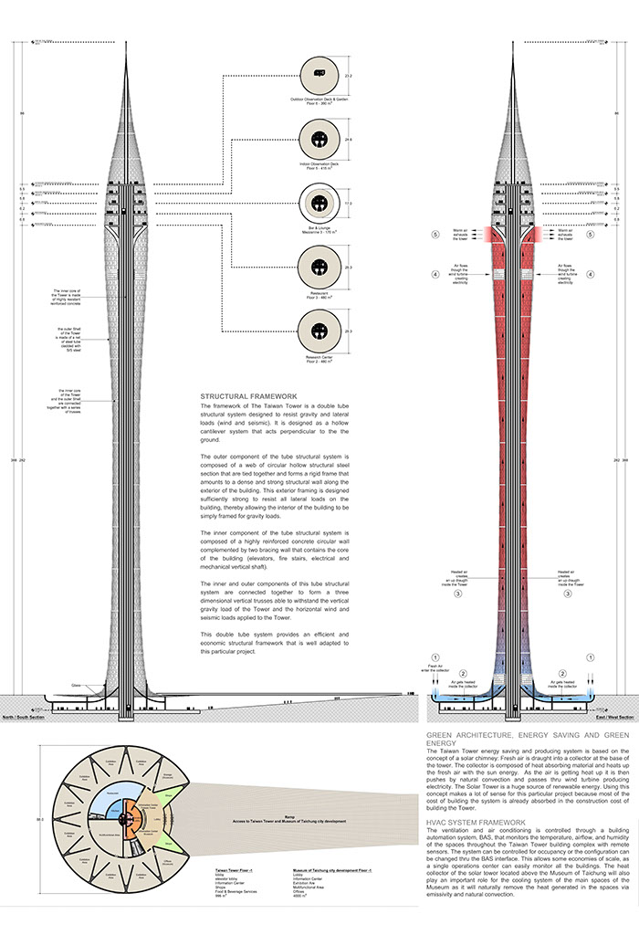 The Taiwan Tower has been envisioned as a landmark that symbolize the spirit of Taiwan and connect the earth to the sky, the past to the future and the tradition to the modernity. The design of the Taiwan Tower is a blend of simplicity and sophistication that give to the tower a timeless appearance, a pure geometrical shape that fit in harmony with its surrounding: The City, The Dadu mountain and further the Taiwan strait.