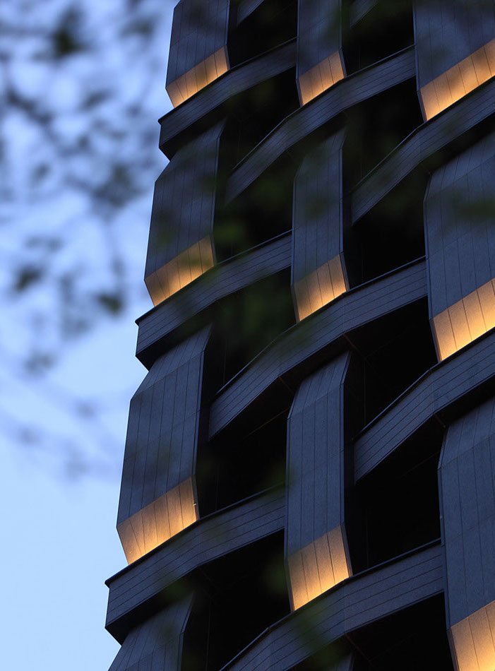 The buildings have a unique design that incorporates a woven pattern throughout their façades. This pattern has been formed by interlacing the horizontal and vertical elements of the architectonic of the building into a single expressive texture made of engraving stripped of grey granites and black aluminium panels. The floor to ceiling windows are set recessed inside the pattern at the intersection of the horizontal and vertical elements and offer breathtaking views of Taipei and the landscape beyond.