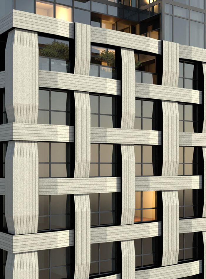 A key element of the design was to give the façades an expressive and powerful character that calls to mind the Asian culture, have a simple yet sophisticated charm, and merge tradition and modernity. These elements were achieved with the design of the woven pattern, as it evokes the vernacular construction made of woven bamboo that can be found throughout the countryside in Asia; acts as a filter to protect the inhabitants from the sun and the direct views; and makes the heavy reinforced concrete earthquake-resistant structure disappear behind it.