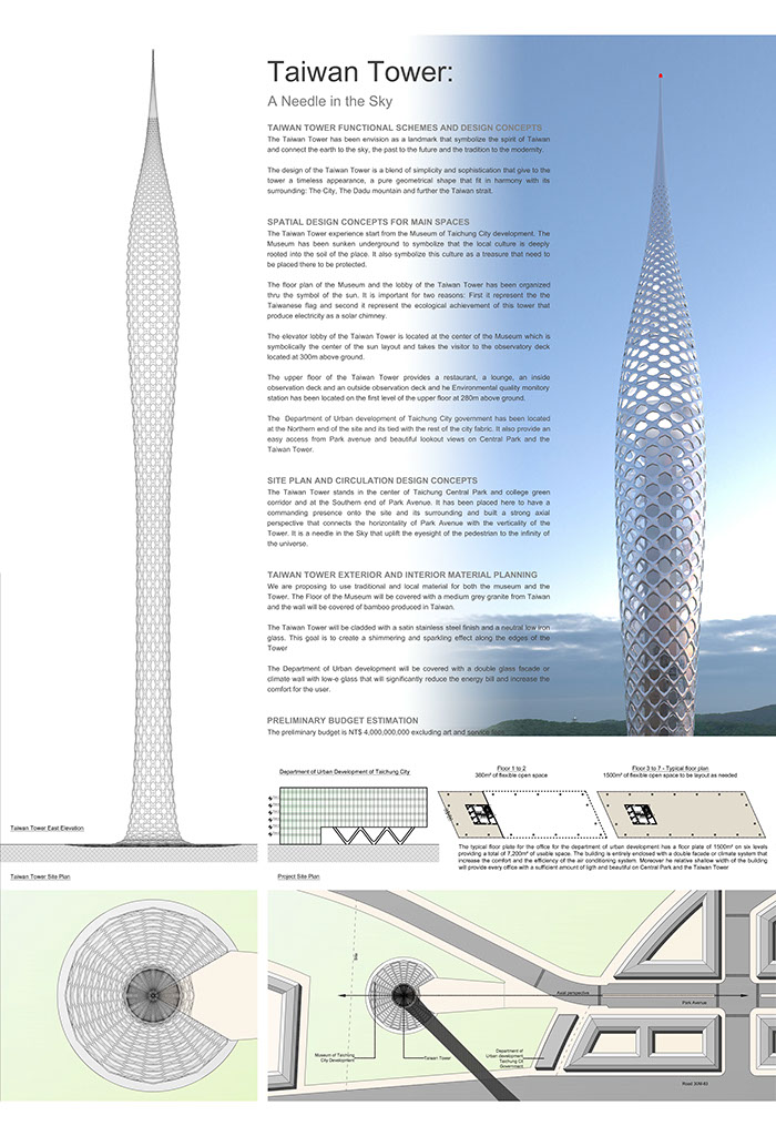 The Taiwan Tower has been envisioned as a landmark that symbolize the spirit of Taiwan and connect the earth to the sky, the past to the future and the tradition to the modernity. The design of the Taiwan Tower is a blend of simplicity and sophistication that give to the tower a timeless appearance, a pure geometrical shape that fit in harmony with its surrounding: The City, The Dadu mountain and further the Taiwan strait.