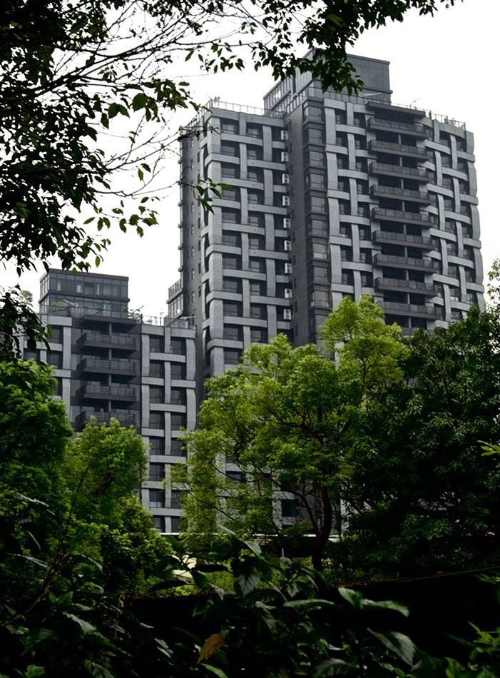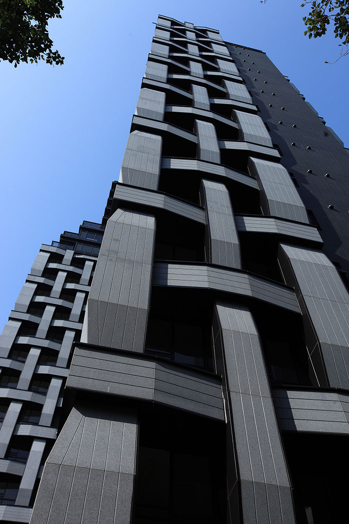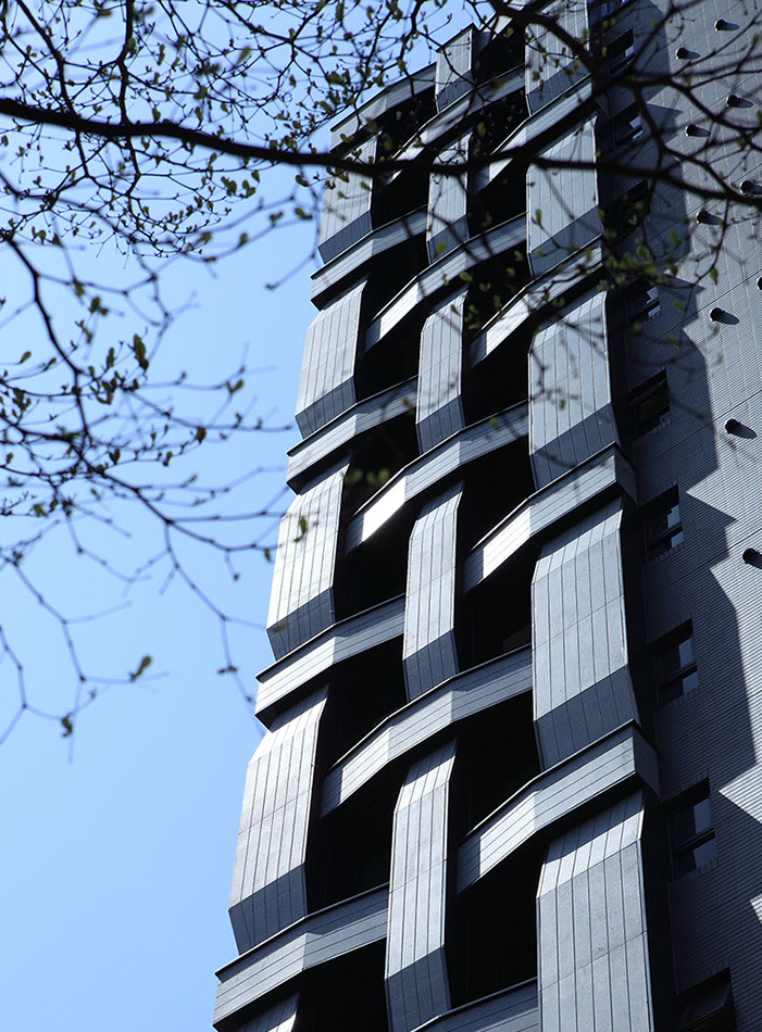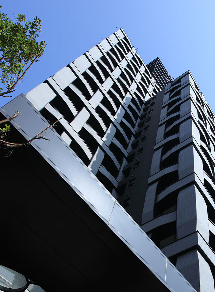 The buildings have a unique design that incorporates a woven pattern throughout their façades. This pattern has been formed by interlacing the horizontal and vertical elements of the architectonic of the building into a single expressive texture made of engraving stripped of grey granites and black aluminium panels. The floor to ceiling windows are set recessed inside the pattern at the intersection of the horizontal and vertical elements and offer breathtaking views of Taipei and the landscape beyond.