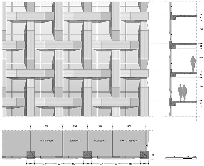A key element of the design was to give the façades an expressive and powerful character that calls to mind the Asian culture, have a simple yet sophisticated charm, and merge tradition and modernity. These elements were achieved with the design of the woven pattern, as it evokes the vernacular construction made of woven bamboo that can be found throughout the countryside in Asia; acts as a filter to protect the inhabitants from the sun and the direct views; and makes the heavy reinforced concrete earthquake-resistant structure disappear behind it.